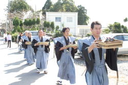 かみしもを着た男たちが、魚や豆を載せたお膳を持って歩く。